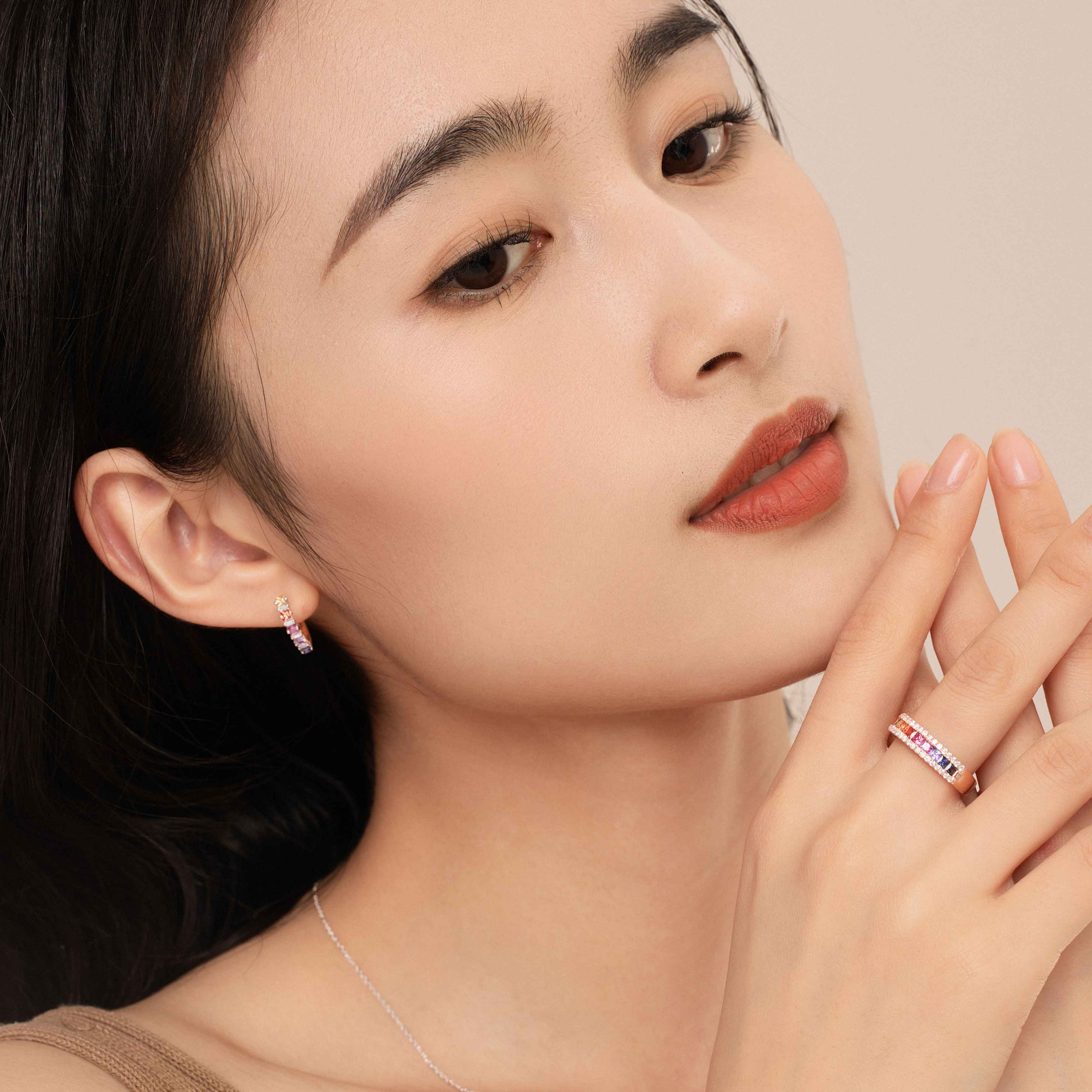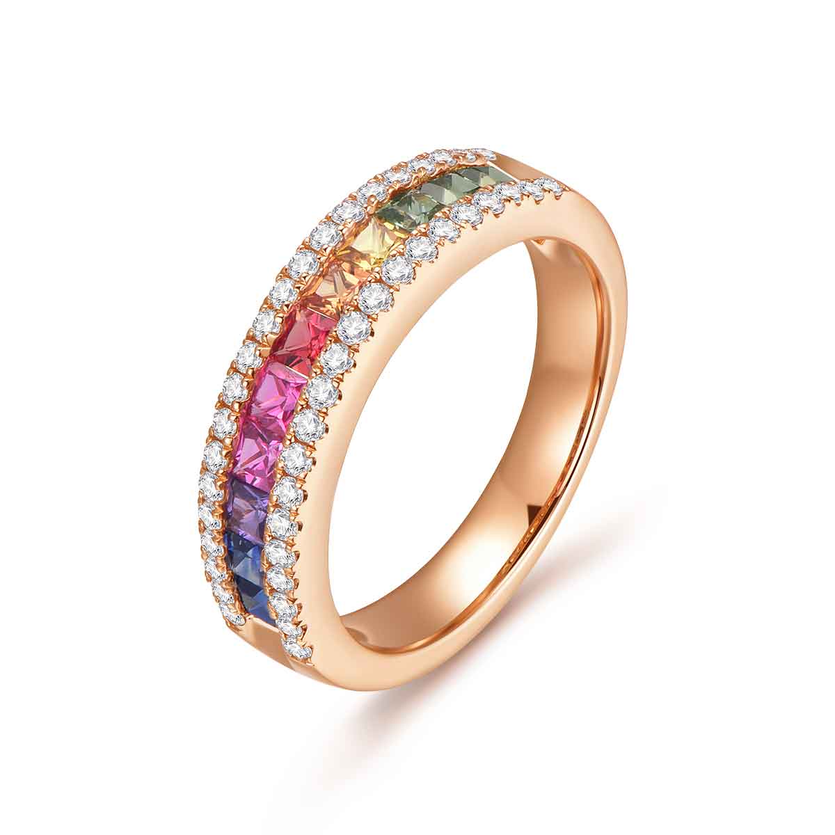 18K玫瑰金 彩虹系列方形彩蓝宝拼镶钻石戒指